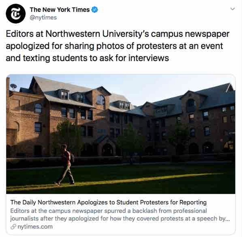The New York Times used a sarcastic headline for its story on the college paper's op-ed: "The Daily Northwestern apologizes to student protesters for reporting."