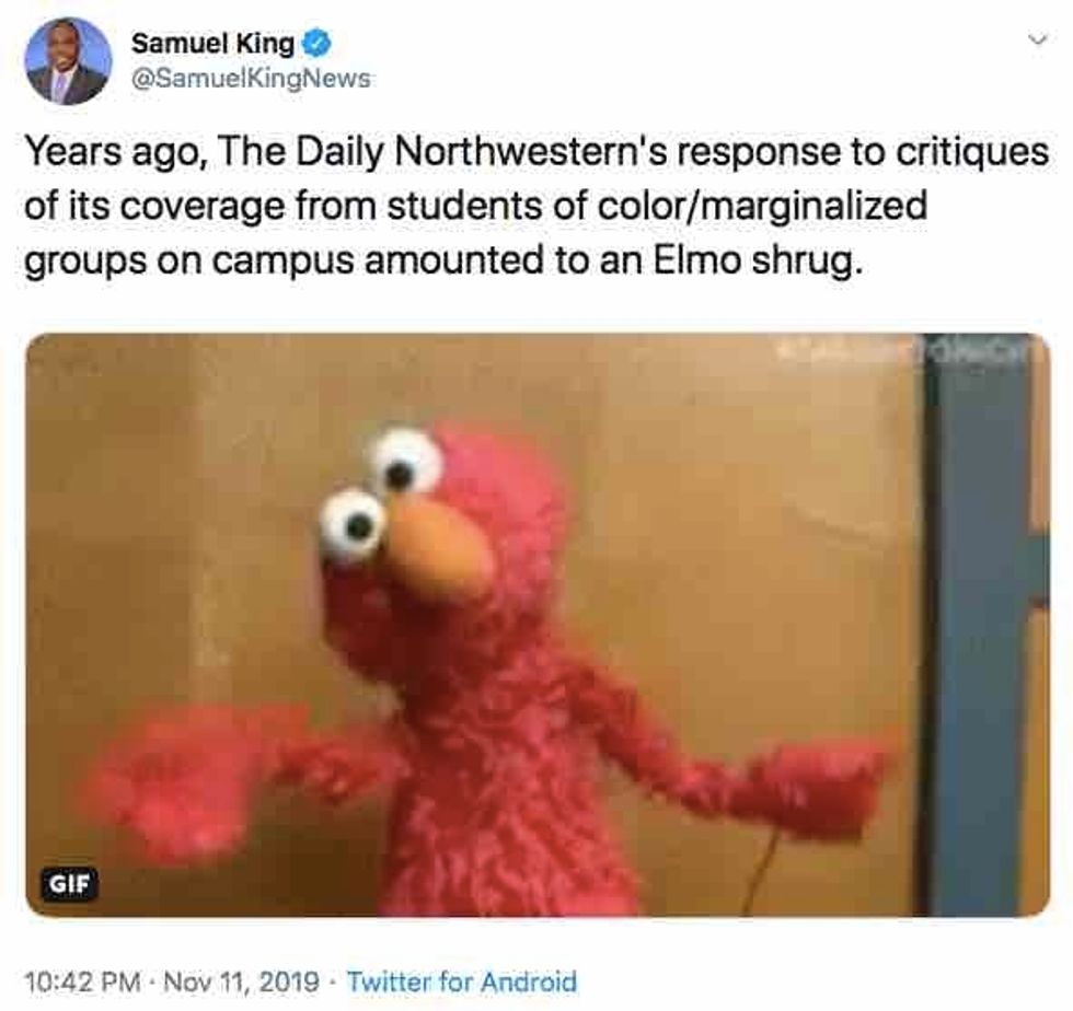 "There's a lot to comment on in this Daily Northwestern editorial," the Chicago Tribune's Gregory Pratt tweeted, "but apologizing for contacting people to ask if they're willing to be interviewed? Regretting that you photographed protesters protesting in public?"