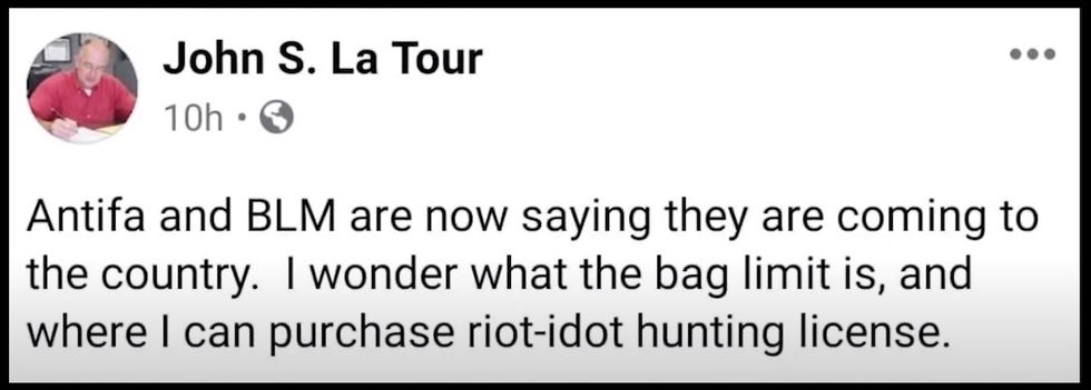"Antifa and BLM are now saying they are coming to the country. I wonder what the bag limit is, and where I can purchase riot-idot [sic] hunting license," read the post.