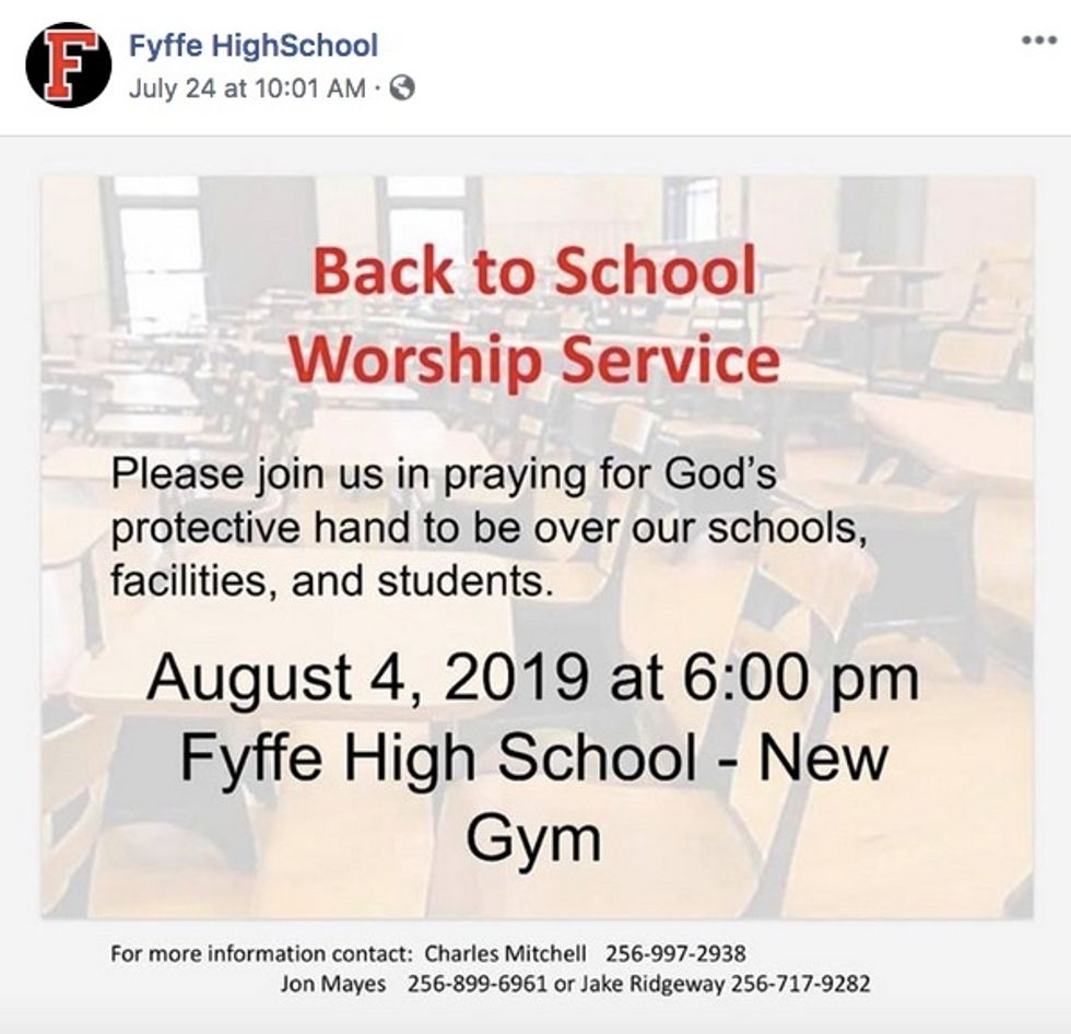 An Alabama public high school announced it's holding a "Back to School Worship Service" this weekend in its gym — and national atheist activist group the Freedom From Religion Foundation didn't take kindly to the news.