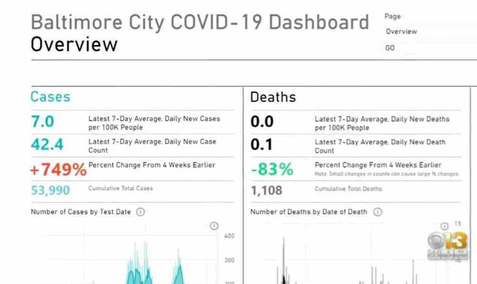 WJZ-TV reported that new COVID-19 cases in Baltimore City are up 749% in just one month but deaths remain down.