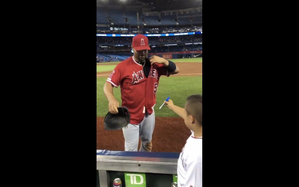 His jersey removed, Pujols signed it for the fan and gave it to him.