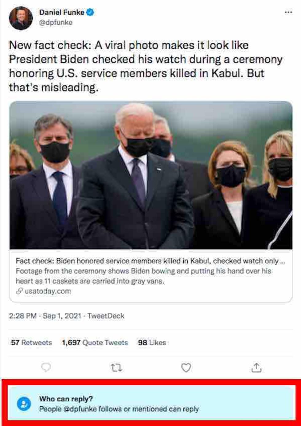 However, Funke's tweet thread about his failed fact-check shows he restricted replies to it to those he's followed or mentioned on Twitter:
