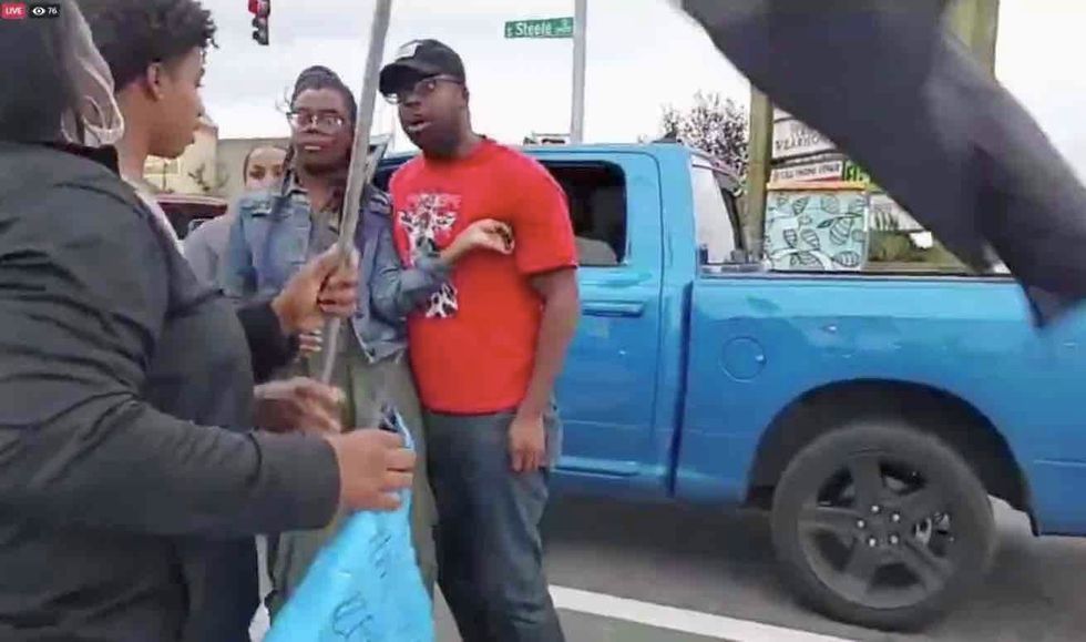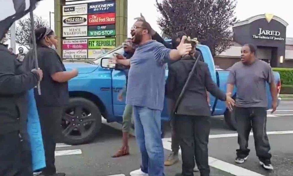 "I'm blacker than you!" the motorist hollers at the group. "I'm blacker than you!"