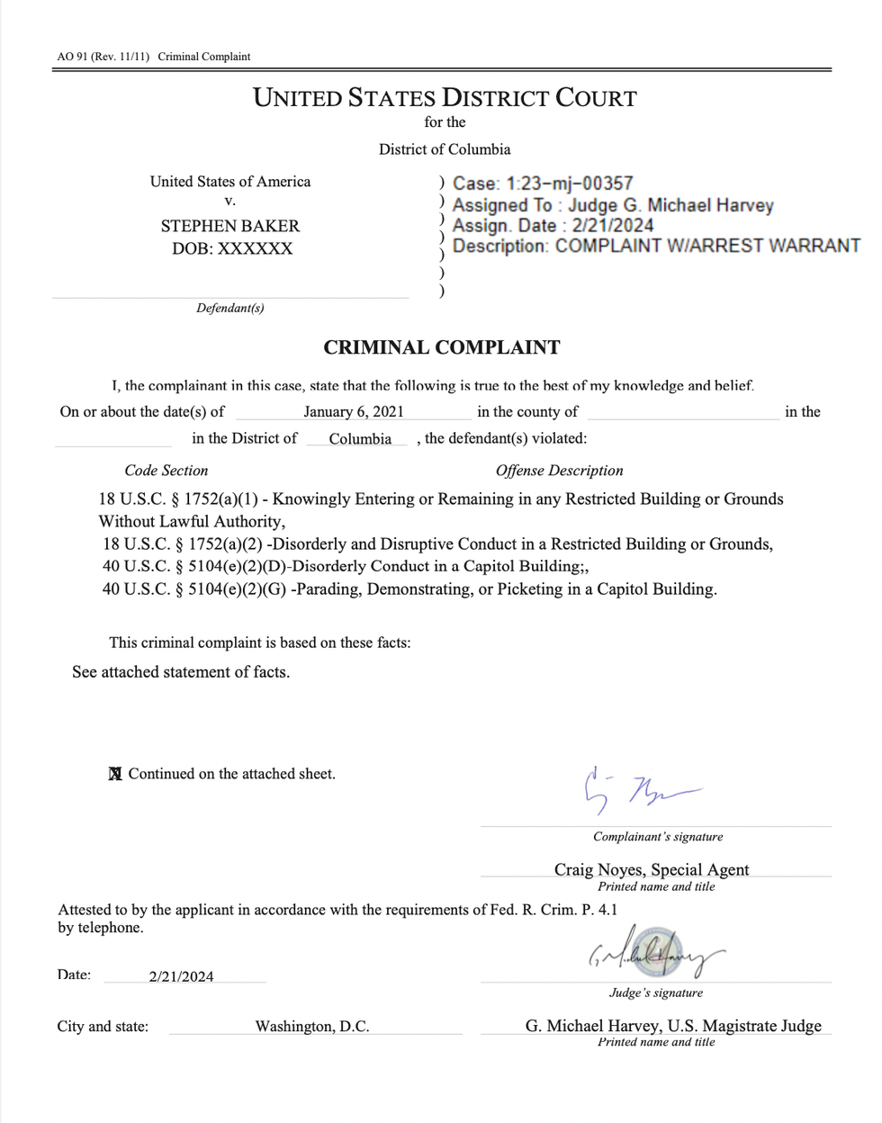 He added, "Steve's complaint is like all of the complaints I have seen — it starts with a significant 'background' section which covers events of the day that have nothing to do with any 'allegation or information' regarding a federal crime Steve Baker is alleged to have committed. In Steve's case, there is also a significant amount of color commentary about his First Amendment-protected speech that did not happen during a time when he is alleged to have committed a crime."