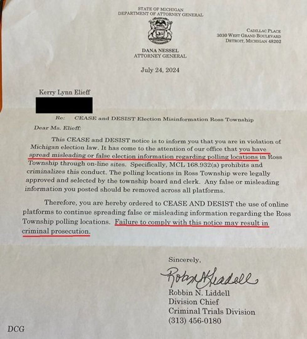 Elieff did ultimately remove her social media posts and videos about the changes in polling locations in Ross Township, intimidated by the warning from Nessel's office about possible "criminal prosecution." Plus, Nessel has previously called providing "a false time or place of voting" "the worst form of misinformation."