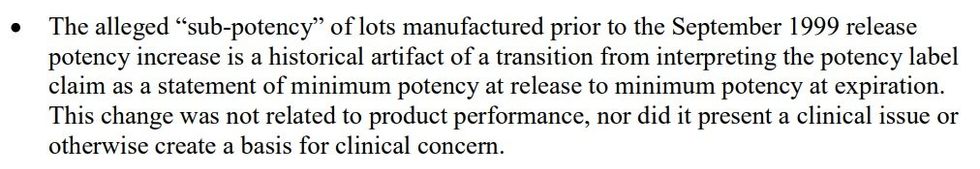 In return, Merck issued a letter that boasted about MMR's overall success at reducing measles, mumps, and rubella infections. The letter also indicated that many of the alleged potency problems associated with the vaccines manufactured before September 1999 could be attributed to a change in "interpreting the potency label claim." "This change was not related to product performance, nor did it present a clinical issue or otherwise create a basis for clinical concern," Merck asserted.