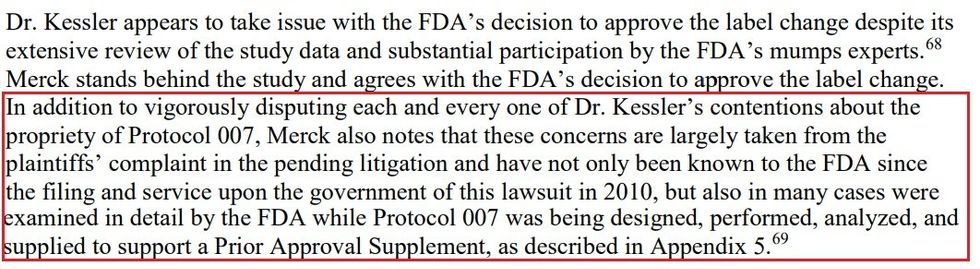 Elsewhere in its response letter, Merck did mention Protocol 007, claiming to "vigorously dispute[] each and every one of Dr. Kessler’s contentions about the propriety of Protocol 007" and insisting that such contentions were based on "plaintiffs’ complaint in the pending litigation." Not only has the FDA known about "concerns" regarding Protocol 007 since at least 2010, Merck's letter claimed, but the FDA had actually "examined" those concerns "in detail ... while Protocol 007 was being designed, performed, analyzed, and supplied to support a Prior Approval Supplement."
