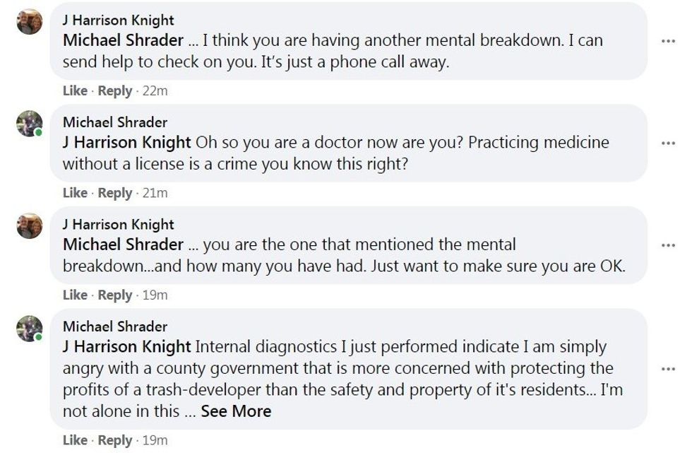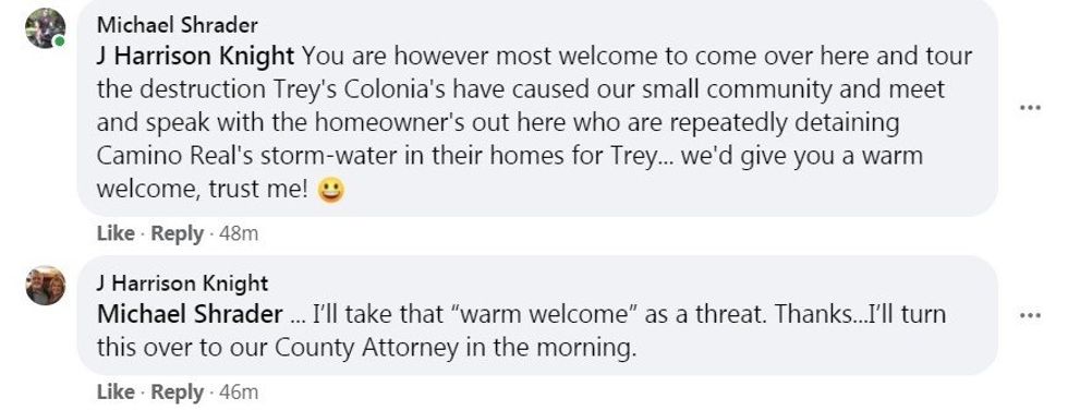 During one heated Facebook conversation in August 2020, Shrader invited Knight to visit the area and see for himself "the destruction [Trey Harris'] Colonia's have caused" in Plum Grove. "[W]e'd give you a warm welcome, trust me!" Shrader wrote with a smiling emoji.