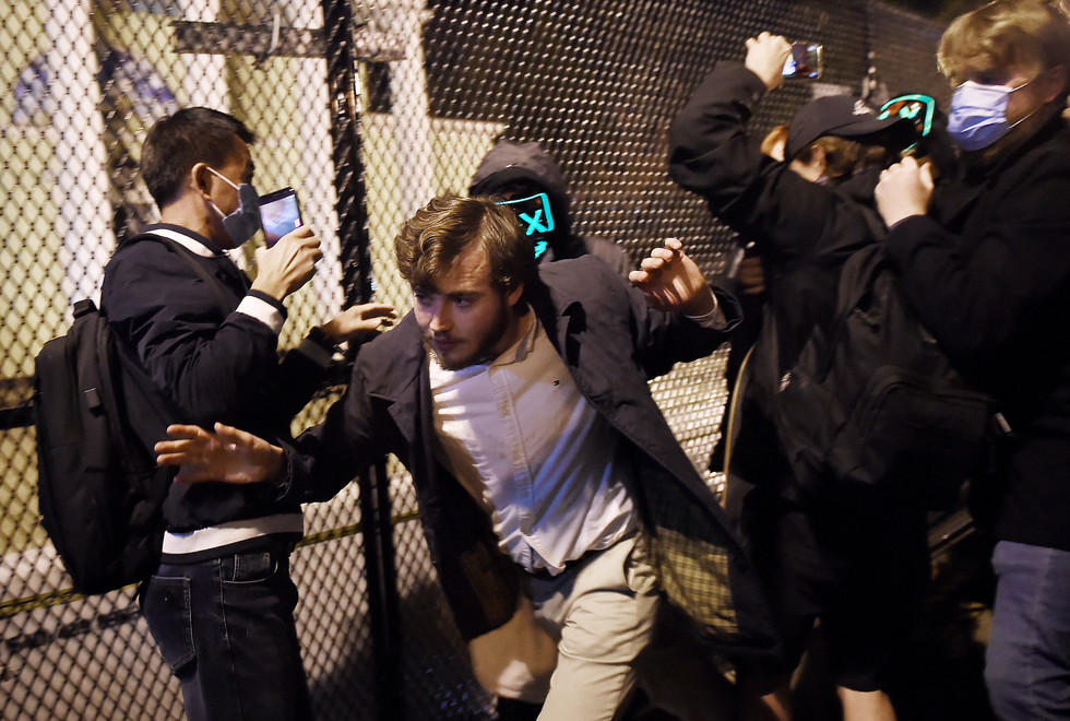 A Trump supporter tries to run from demonstrators at Black Lives Matter Plaza across from the White House on election night in Washington, D.C., Nov. 3, 2020.