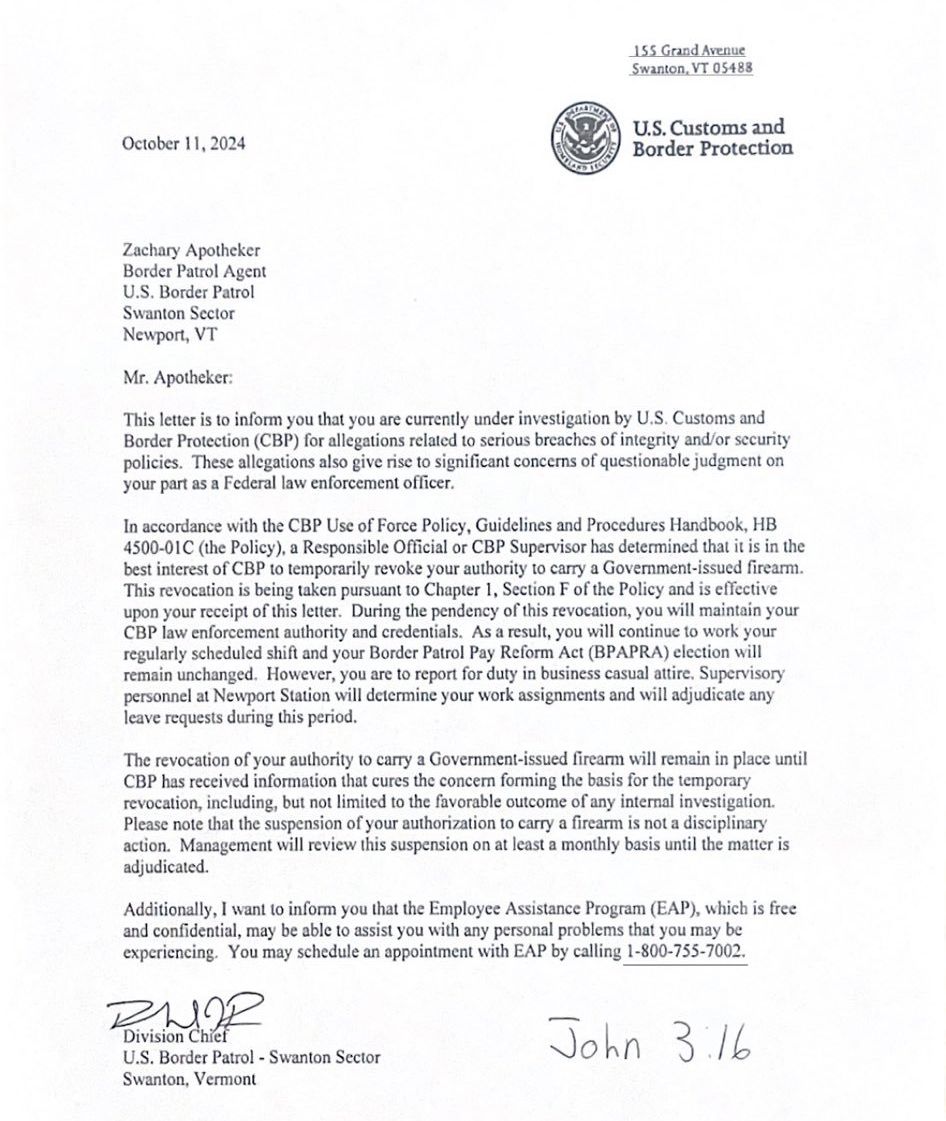 Apotheker was required to hand in the rest of his Border Patrol gear, including his badge, body armor, and radio.