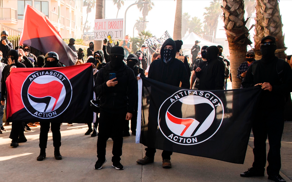 Antifa gather in San Diego to confront "Patriot March" rally in support of then-President Donald Trump, Jan. 9, 2021.