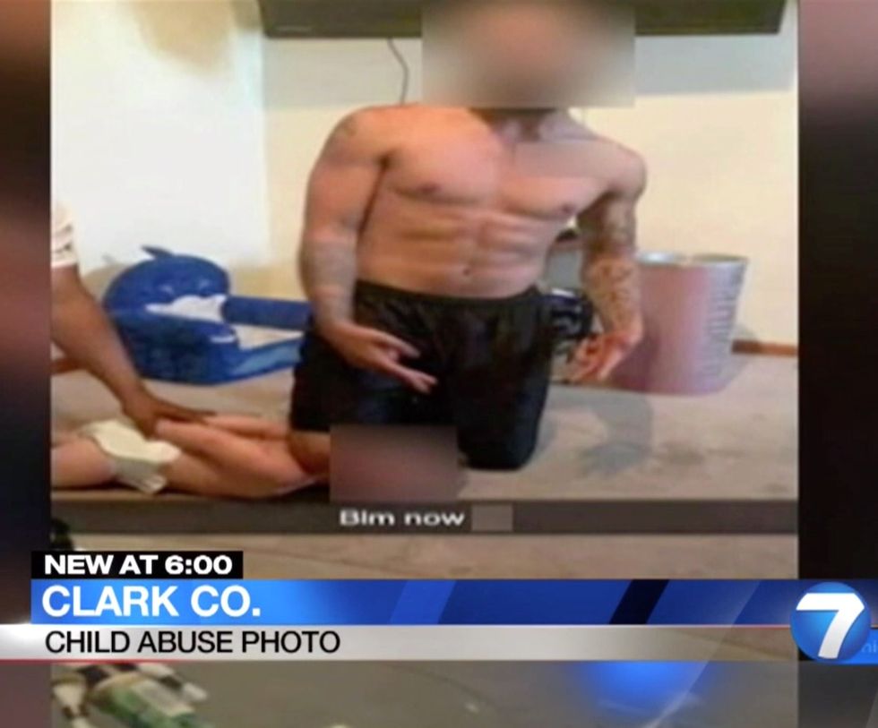 The photo shows a shirtless tattooed man kneeling on the baby, who is crying, while another person holds the child's arms behind their back.