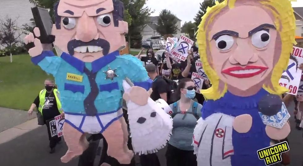 The protesters demanded the resignation of Minneapolis Police Officers Federation President Bob Kroll and then hoisted up a piñata with the visage of his wife, Liz Collin, who is a news anchor at WCCO-TV.