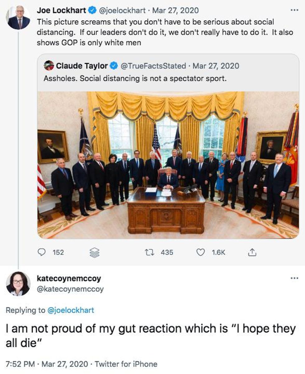 Last March, Coyne-McCoy responded to a picture that included then-President Donald Trump, members of his Cabinet, top congressional Republicans, and Dr. Anthony Fauci, among others, by saying her "gut reaction" to the photo is that hoped each person in the photo dies.
