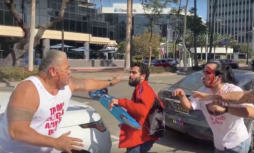 A fight broke out between a supporter of President Donald Trump — who was with a group rallying outside a Democratic event in Long Beach, California, Saturday — and a pair of anti-Trump counterprotesters, KABC-TV reported.