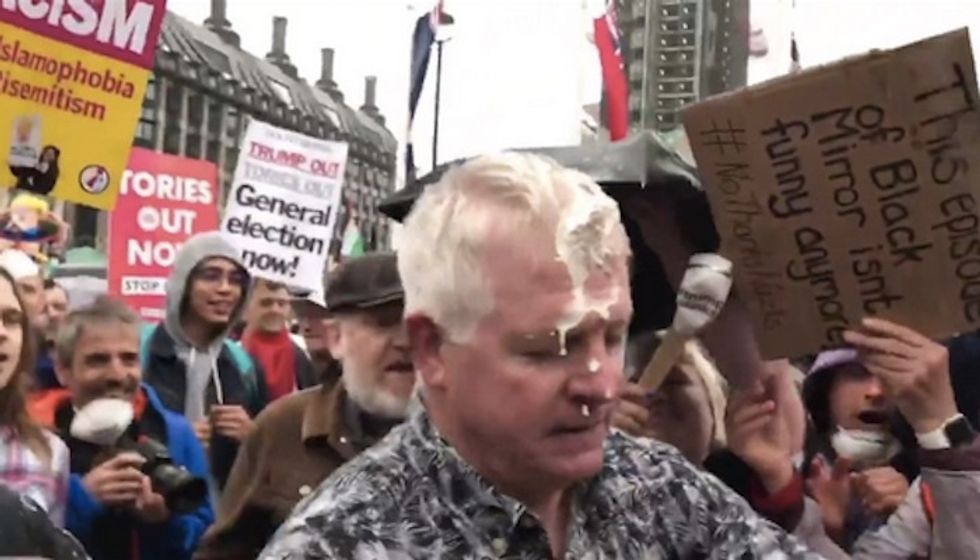 The milkshake tossing trend has extended beyond political figures in the UK, as a supporter of President Donald Trump got hit with one in London last week during Trump's state visit. Leftists surrounding the lone man chanted "Nazi scum" at him: