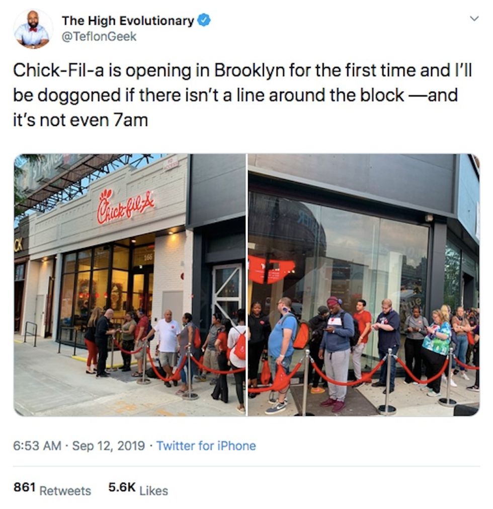 Chick-fil-A opened its first restaurant in Brooklyn on Thursday morning — and one observer noted, "I'll be doggoned if there isn't a line around the block — and it's not even 7 a.m."