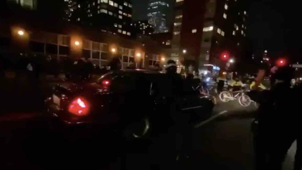 A motorist was caught on video plowing through a line of New York City police officers after being ordered to stop amid rioting in Brooklyn on Tuesday night.