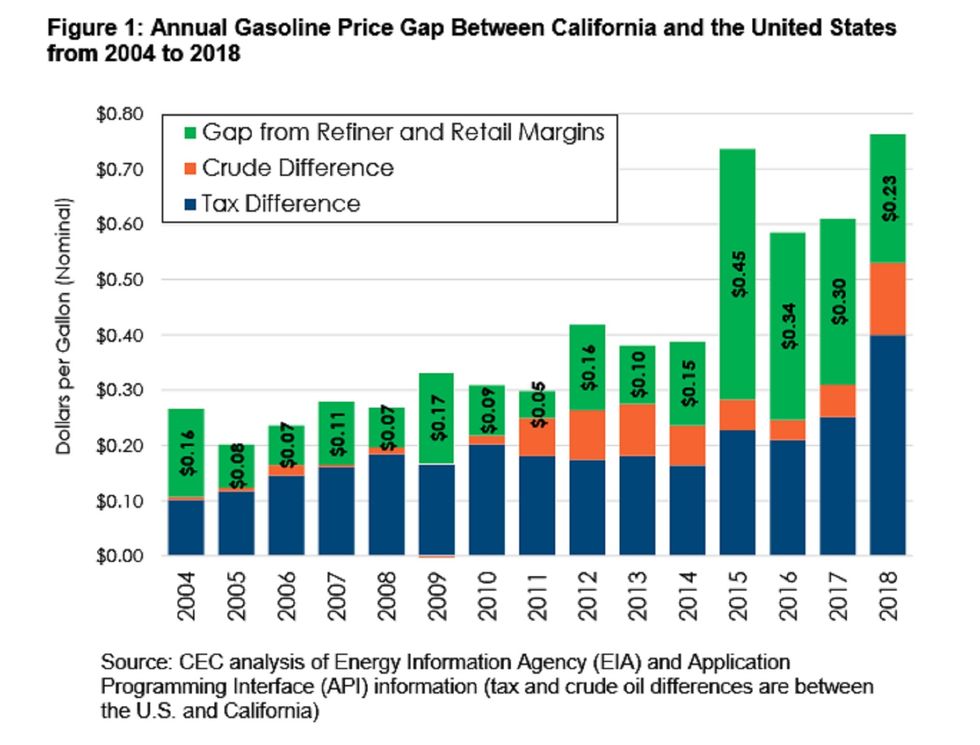The CEC's analysis also includes a series of bar graphs to show the spike in prices California consumers pay in relation to the rest of the nation, including the drastic jump seen in the state's gas taxes in 2018.
