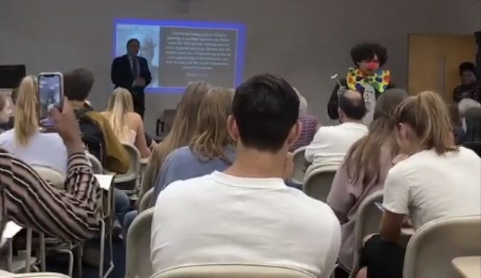 So as the clown's horn kept blaring and angry leftists hollered "bulls**t" at the presenter, a pair of campus police officers showed up and instructed a handful of protesters to step outside the room.