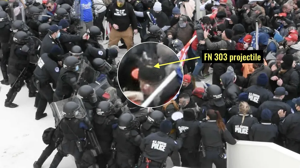 While Black was getting attention for his wound, a pepper ball fired from above struck a Capitol Police CDU officer in the back of the helmet, sending a cloud of pepper powder into the air. A second shot narrowly missed another officer’s head and exploded on the officer's riot shield, video showed.
