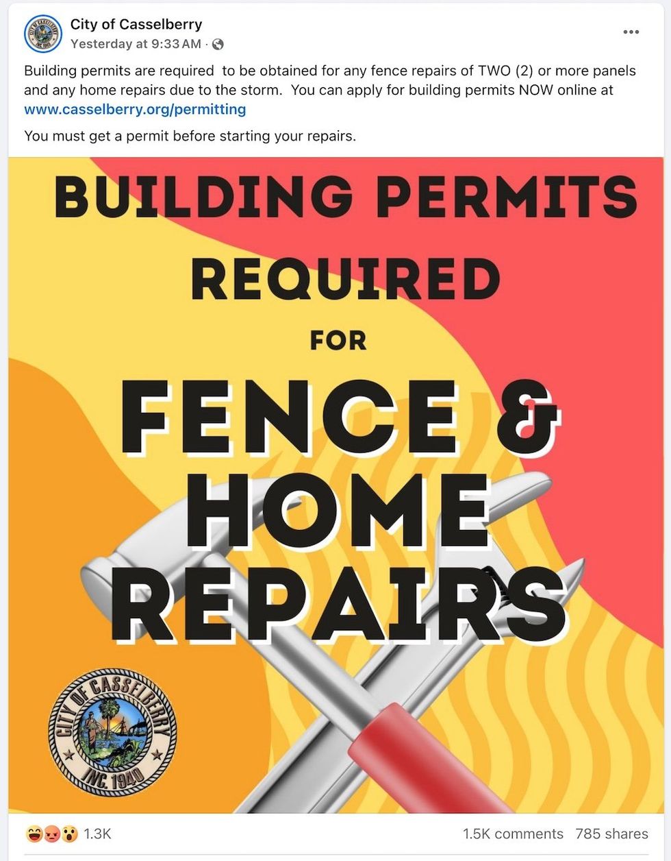 "Building permits are required to be obtained for any fence repairs of TWO (2) or more panels and any home repairs due to the storm," the post read. "You must get a permit before starting your repairs."