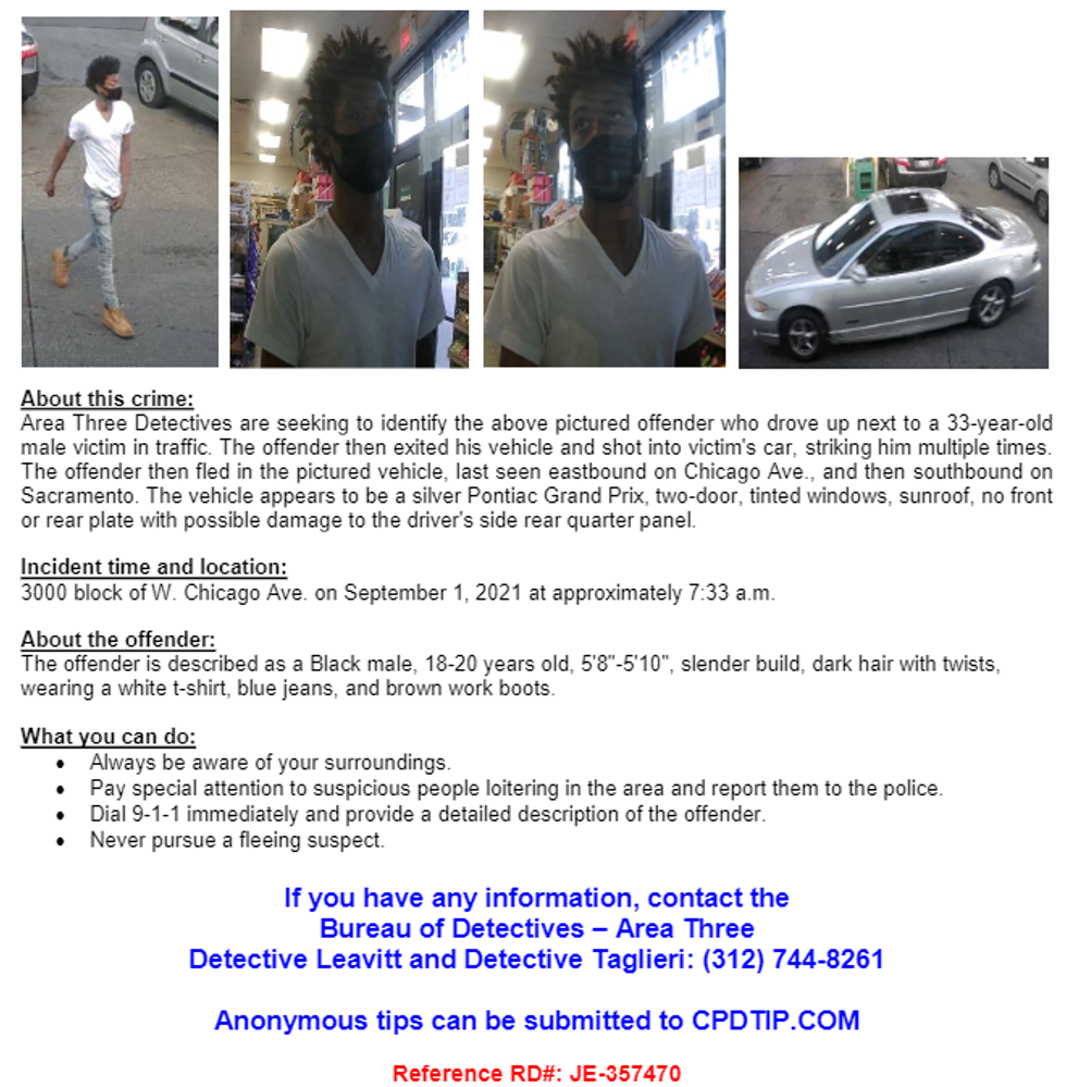 The Chicago Police Department released photos of the suspected shooter. He is believed to be between 18-20 years old, between 5'8-5'10, and has a slender build. He was driving a two-door silver Pontiac Grand Prix.