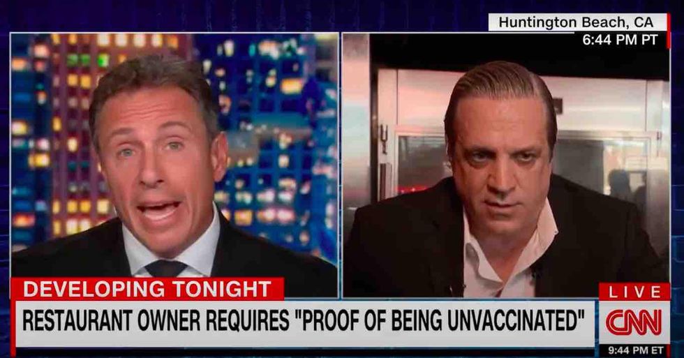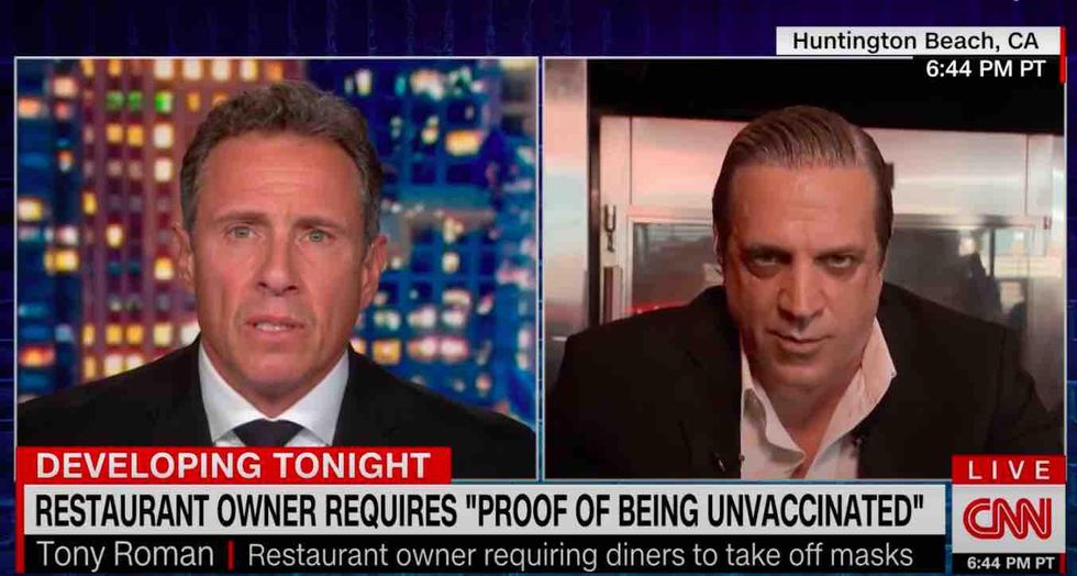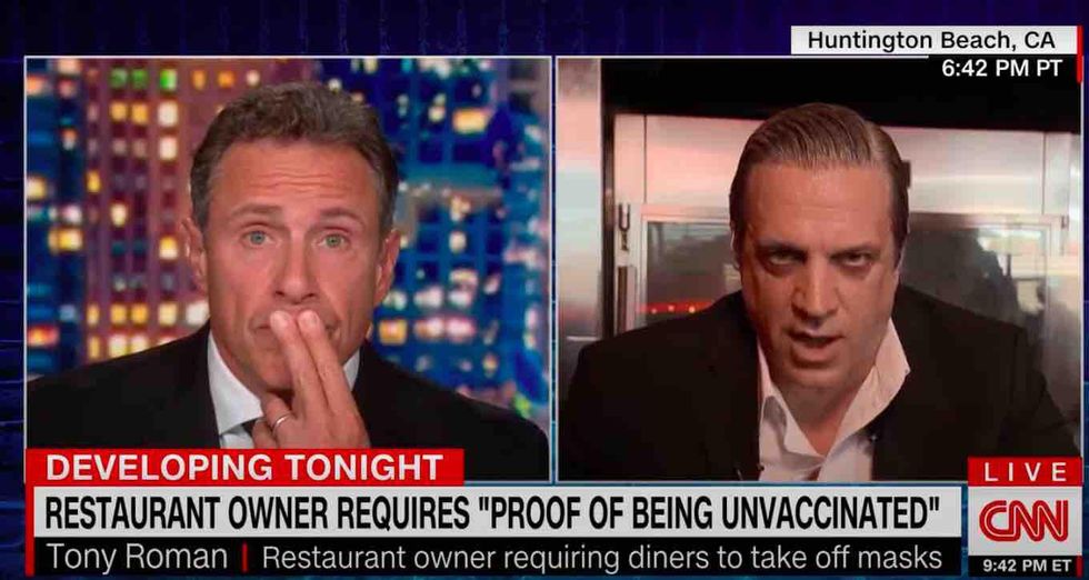 And Cuomo was back for more action Wednesday, going head to head with Tony Roman, owner of Italian restaurant Basilico's Pasta e Vino in Huntington Beach, California, who posted a front-door sign requiring that patrons provide "proof of being UNvaccinated."