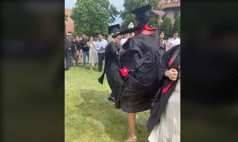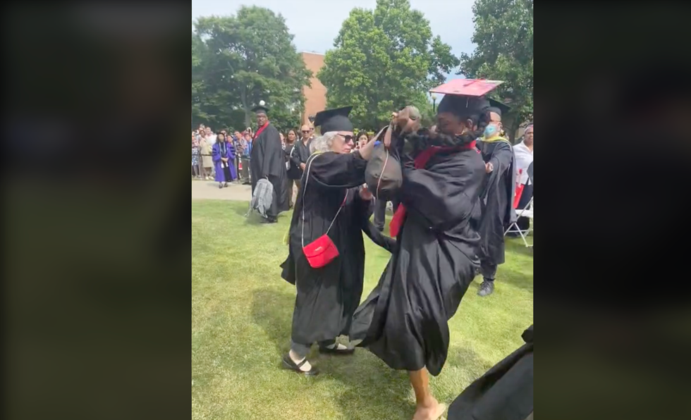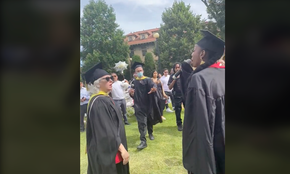 The TikTok user in question — @kadiaimantv — posted a separate video offering her perspective on the incident. She does not mention the name of the school or her own name, but she does reference the academic term "major," which would seem to indicate the incident occurred at a college. The caps and gowns worn by non-students in the primary video also appear to indicate the incident occurred at a college: