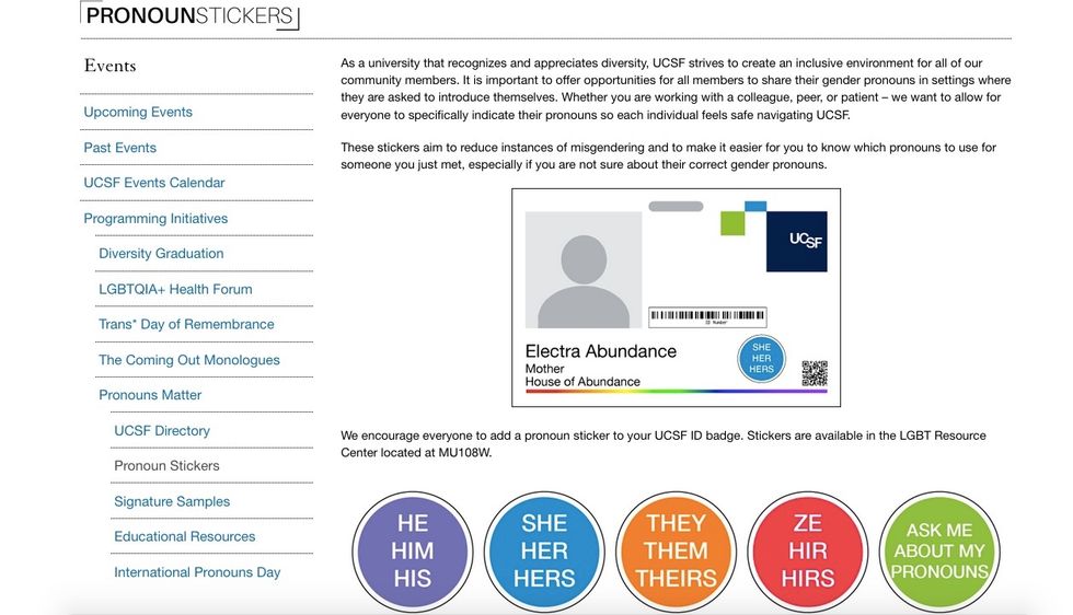 "As a university that recognizes and appreciates diversity, UCSF strives to create an inclusive environment for all of our community members," according to the school's Lesbian, Gay, Bisexual and Transgender Resource Center. "It is important to offer opportunities for all members to share their gender pronouns in settings where they are asked to introduce themselves. Whether you are working with a colleague, peer, or patient — we want to allow for everyone to specifically indicate their pronouns so each individual feels safe navigating UCSF."