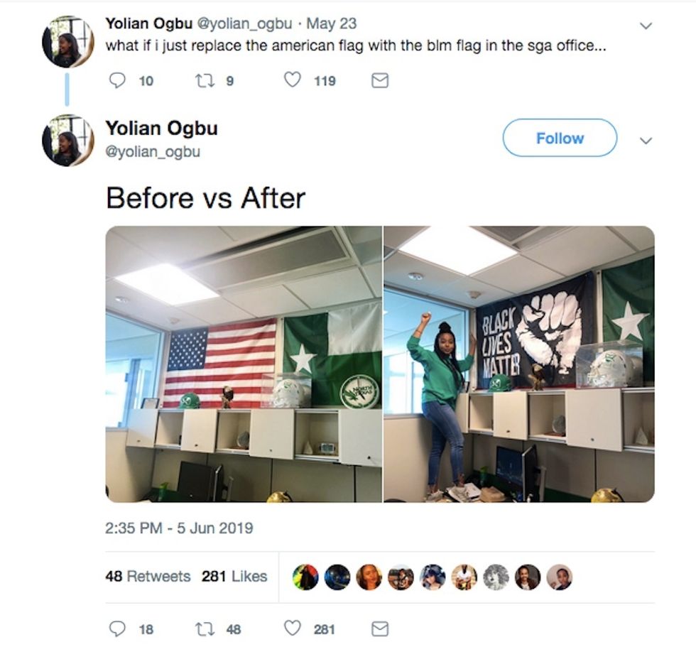 The photos followed a May 23 tweet from Ogbu saying: "what if i just replace the American flag with the BLM flag in the SGA office…"