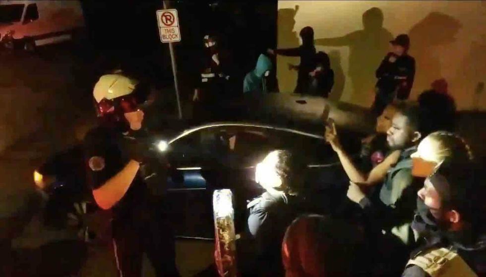 Portland police said in their early Saturday statement that the woman jumped on the officer's motorcycle, the Oregonian reported. But the paper noted that independent photojournalist Sean Bascom — who posted the video of the incident — said "no one 'jumped on the motorcycle.' The protesters planted their feet in front of it and were driven into."
