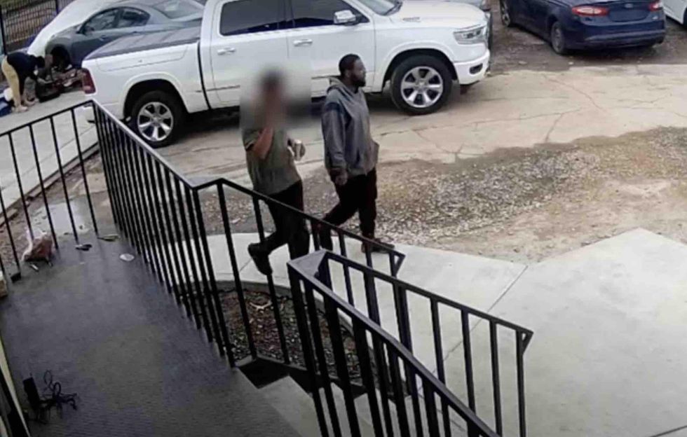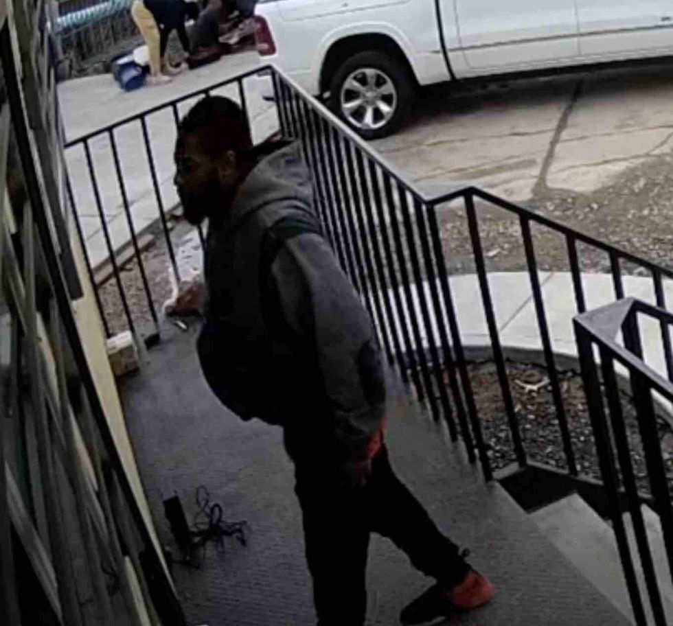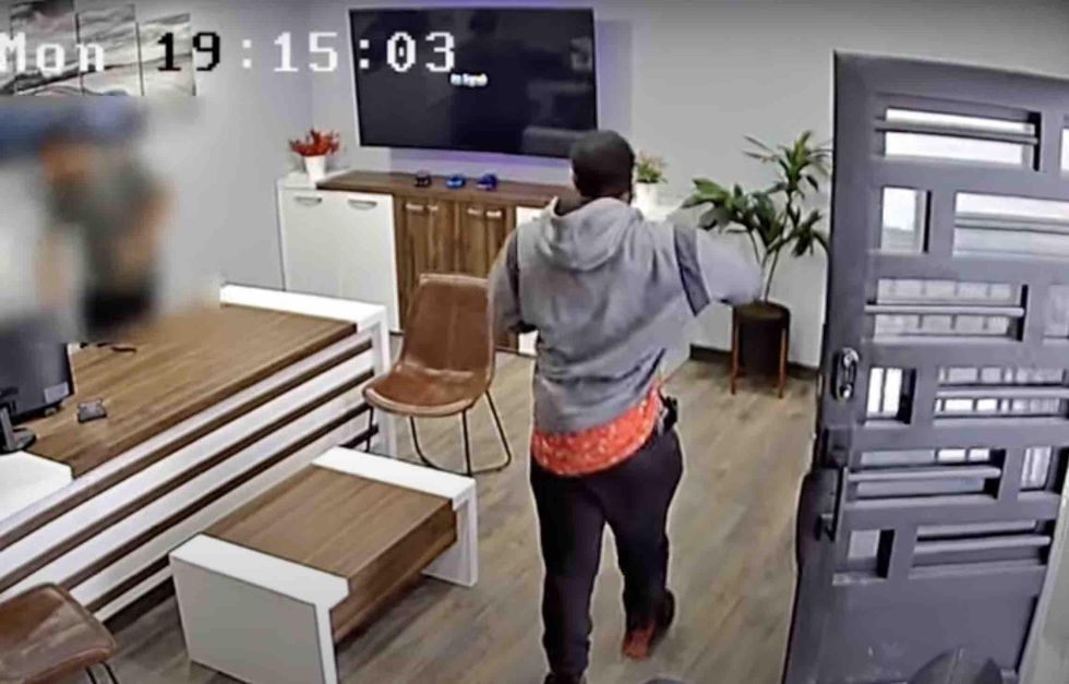Video shows the employee walking into the office, and the suspect following behind — and reaching below his hoodie before going inside.