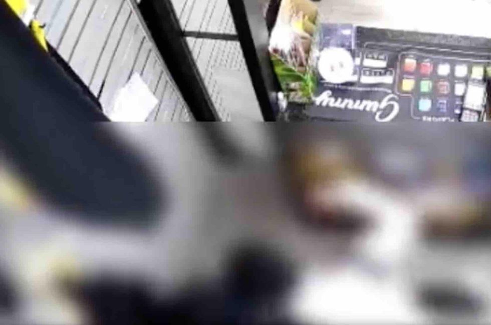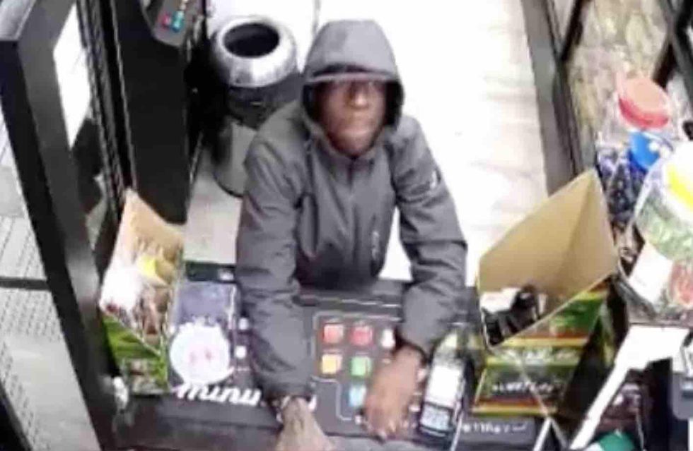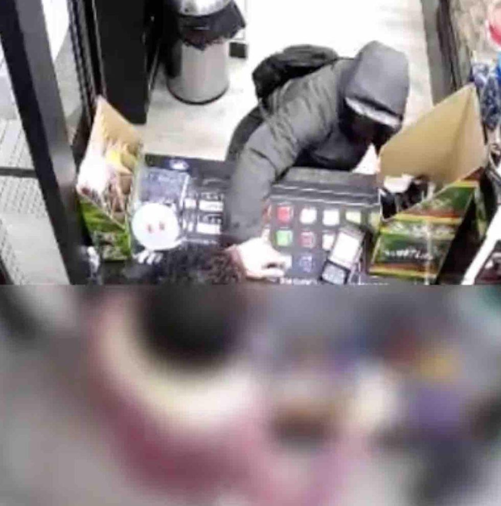 With that, the crook climbed atop the counter, casually walked to the edge, and jumped down to other side to finish off getting what he reportedly came for.