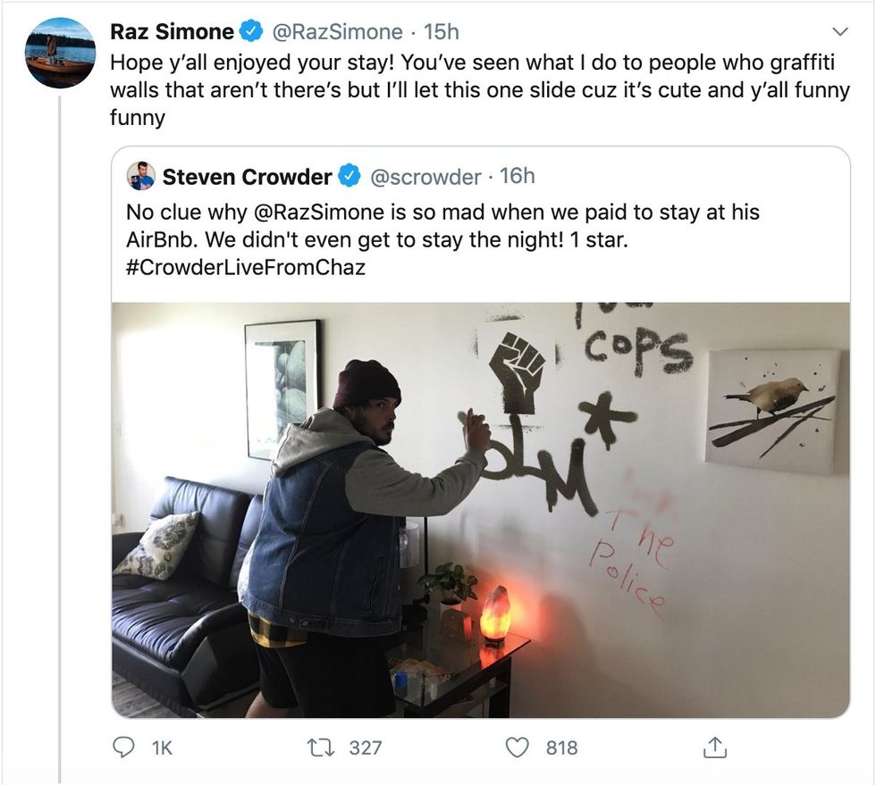 In the caption, Crowder wrote: "No clue why [Raz Simone] is so mad when we paid to stay at his AirBnb. We didn't even get to stay the night! 1 star."