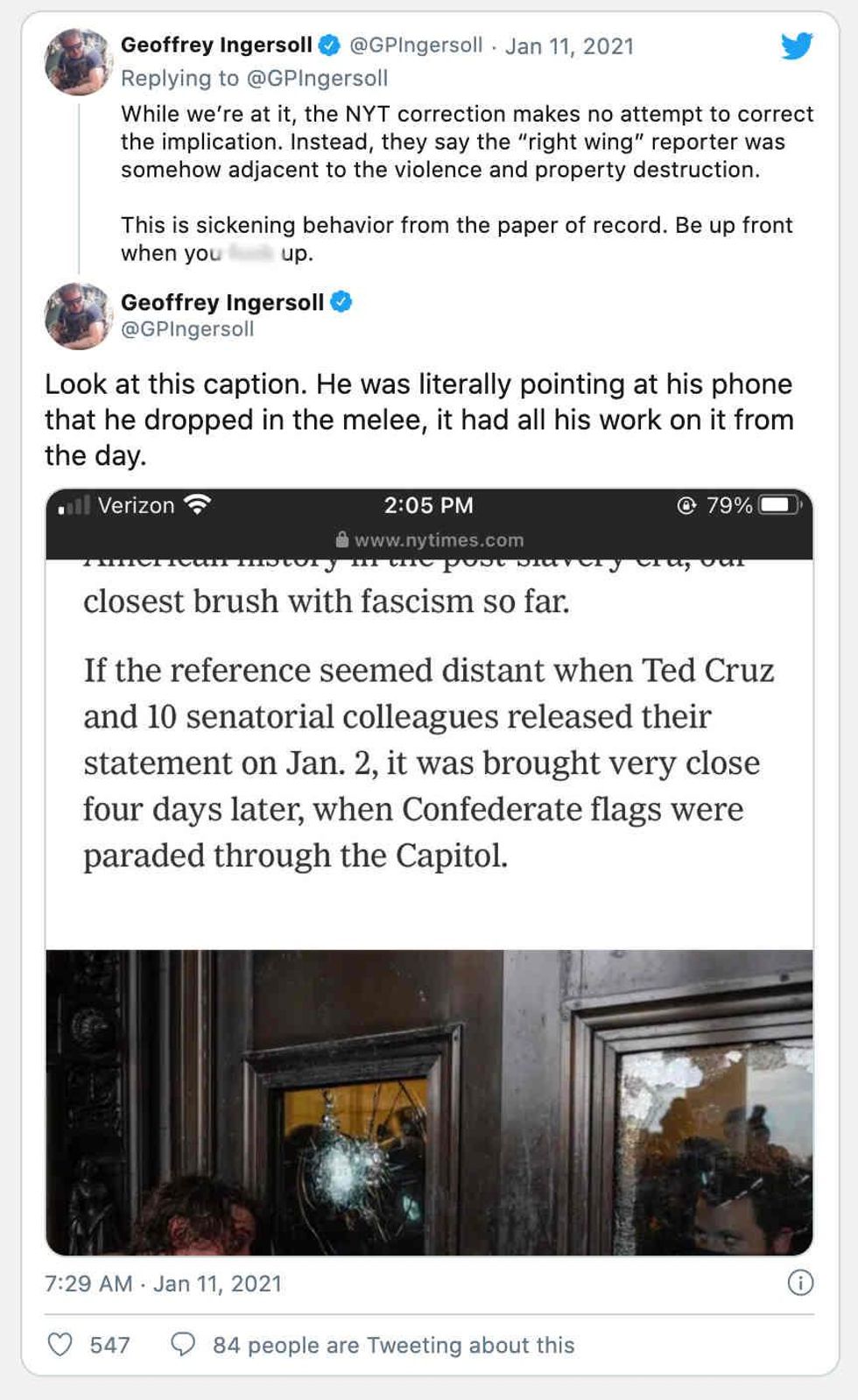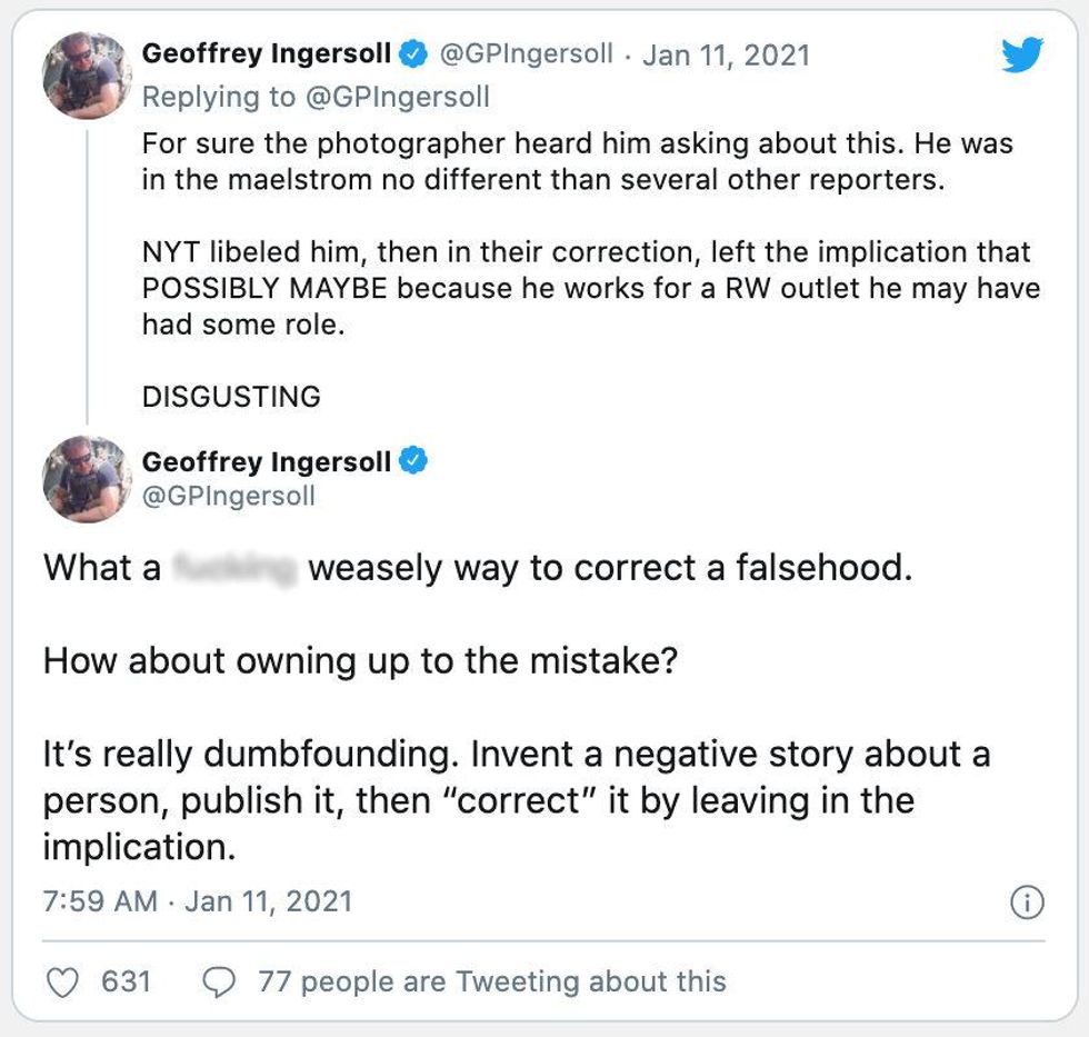 The Daily Caller's editor-in-chief, Geoffrey Ingersoll, blasted the New York Times on Monday after the Sunday edition of the paper falsely identified a credentialed reporter with the outlet as a rioter and falsely accused him of participating in violent activity at the U.S. Capitol on Wednesday.