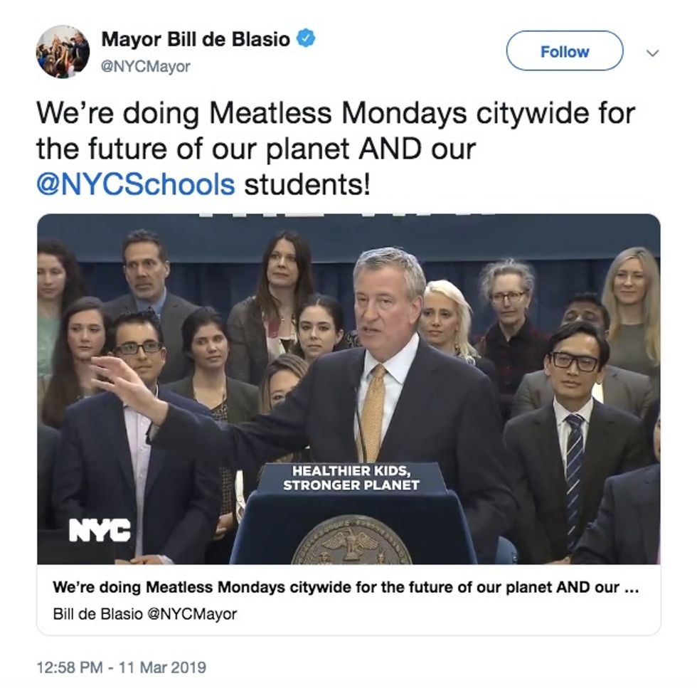 "Cutting back on meat a little will improve New Yorkers' health and reduce greenhouse gas emissions," de Blasio said, the station said. "We're expanding Meatless Mondays to all public schools to keep our lunch and planet green for generations to come."