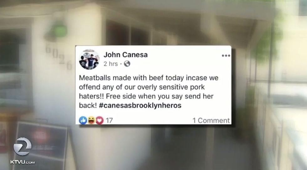 "Meatballs made with beef today in case we offend any of our overly sensitive pork haters!! Free side when you say send her back! #canesasbrooklynheros," the post read, KTVU-TV reported.
