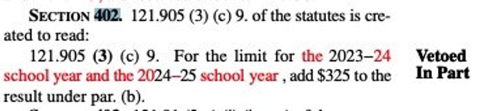 But using his broad power to issue partial vetos, Evers edited the bill on the fly, striking the "24" from the reference to the first school year and the hyphen and "20" from the reference to the "2024-25 school year" so that it reads "2023-2425."