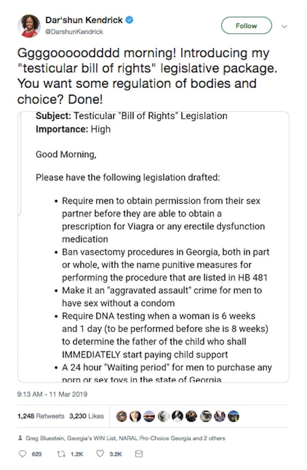 Despite her realization that it has little hope of passing, Georgia Democratic state Rep. Dar'shun Kendrick told Rolling Stone she's "dead serious" about her much ballyhooed "Testicular Bill of Rights" she trumpeted Monday morning on Twitter.