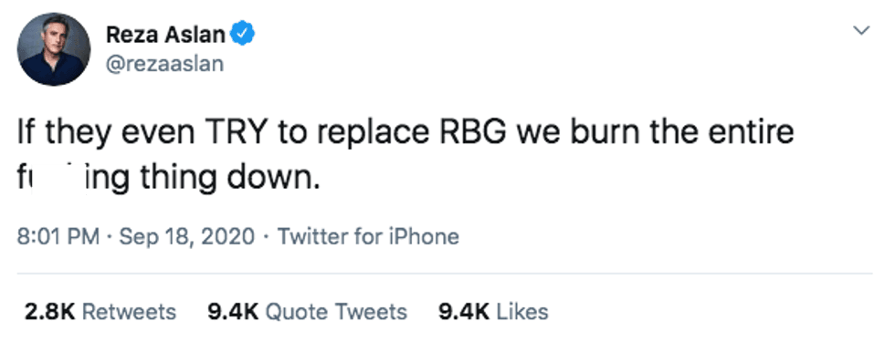 Reza Aslan, a former CNN host, said, "If they even TRY to replace RBG we burn the entire f***ing thing down."