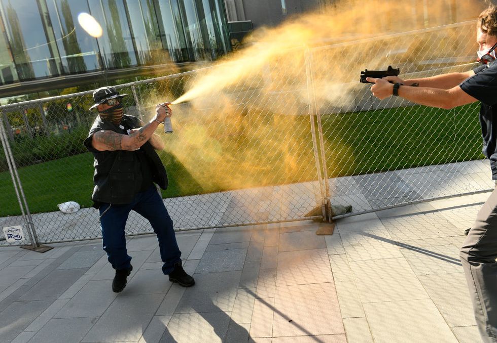 There was an incident where Kelter got into a verbal altercation with a man wearing a "Black Guns Matter" shirt at around 3:30 p.m. local time. Keltner, who has a can of Mace in his hand, steps away from the argument and goes out of the view of the camera.