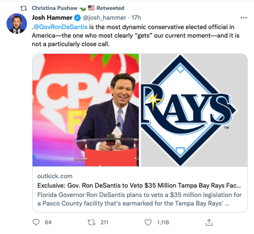 For now, it appears a spokeswoman for DeSantis, Christina Pushaw, may have offered a clue by curiously retweeting Newsweek editor Josh Hammer's take on the news, according to Mediate.
