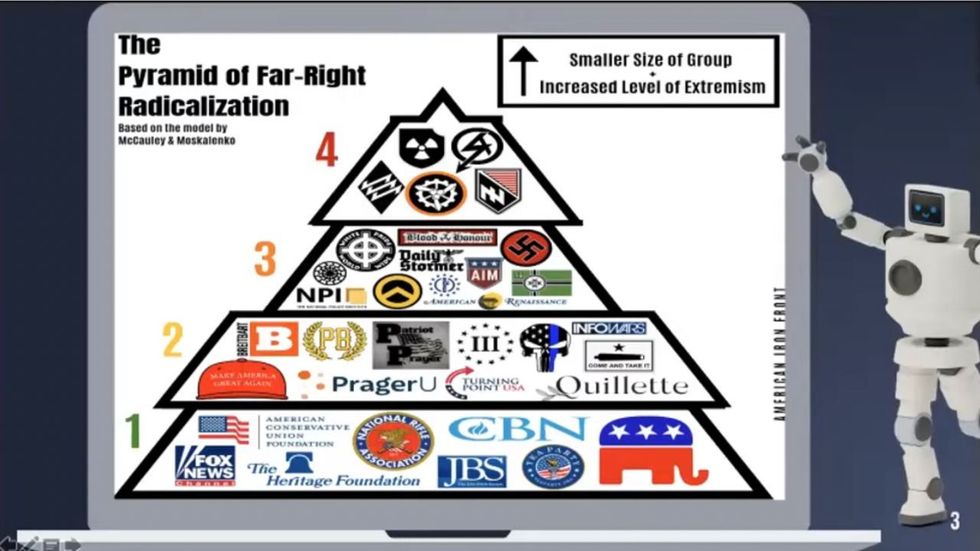 The chart, labeled “The Pyramid of Far-Right Radicalization,” sorted various Christian, conservative, and known neo-Nazi groups into a pyramid. It placed “smaller” organizations with an “increased level of extremism” closer to the top.