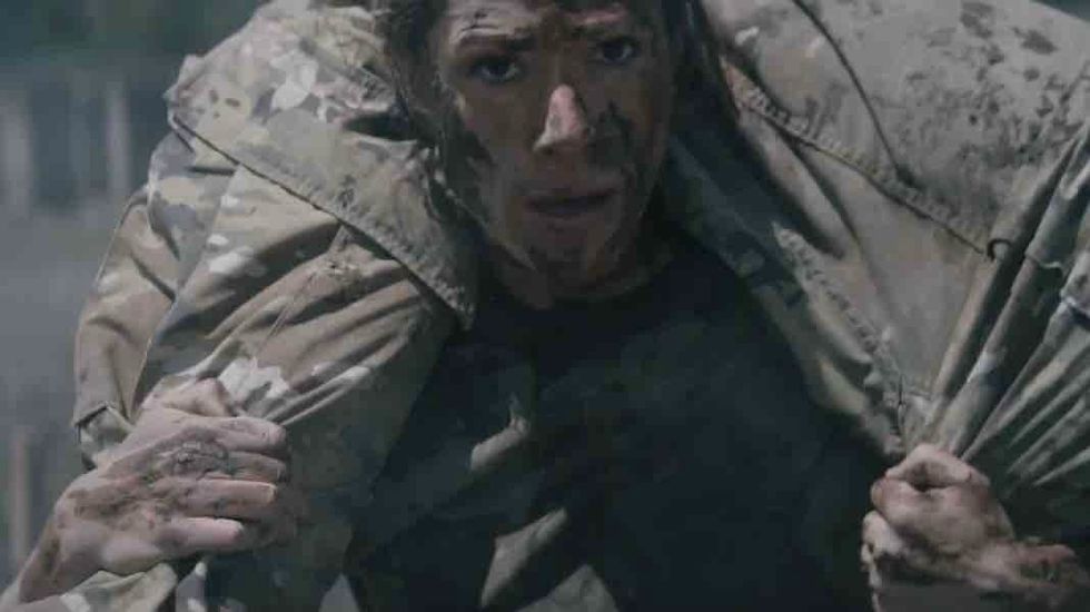 The commercial also highlights a fancy-dressed elderly woman as "too old," and a woman in the military going through a muddy obstacle course as "too pretty."
