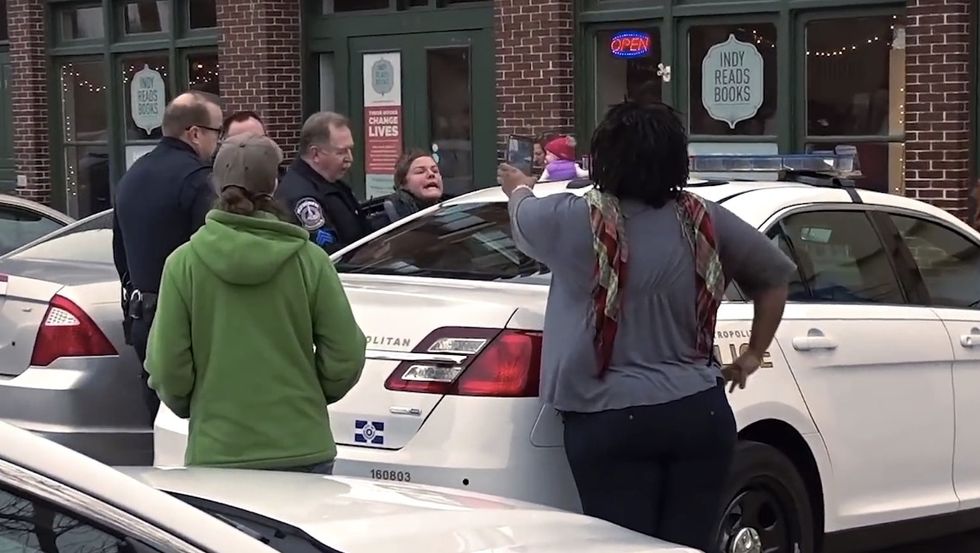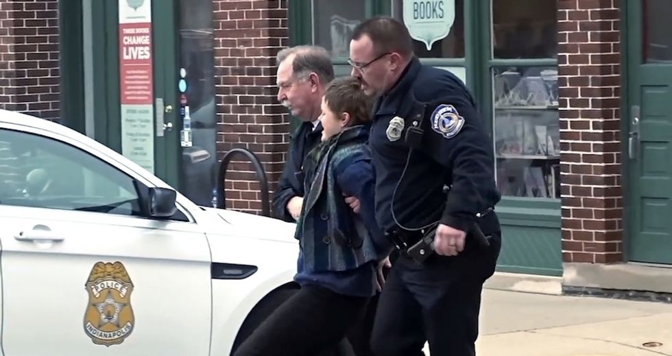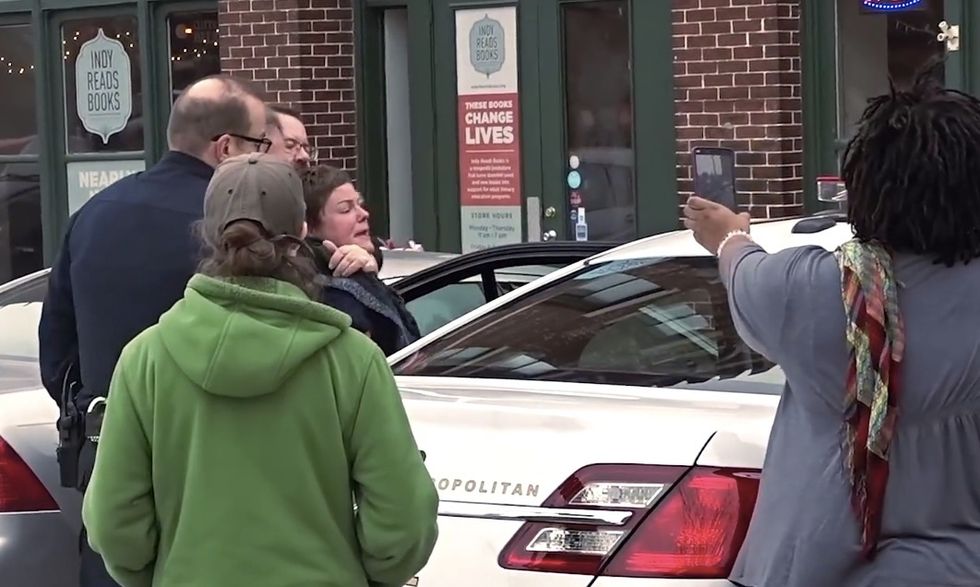 A woman was caught on video allegedly trying to take a Virgin Mary statue from a Catholic group protesting a Drag Queen Story Hour in Indianapolis — and then was seen freaking out at police who intervened and pulled her from the scene.