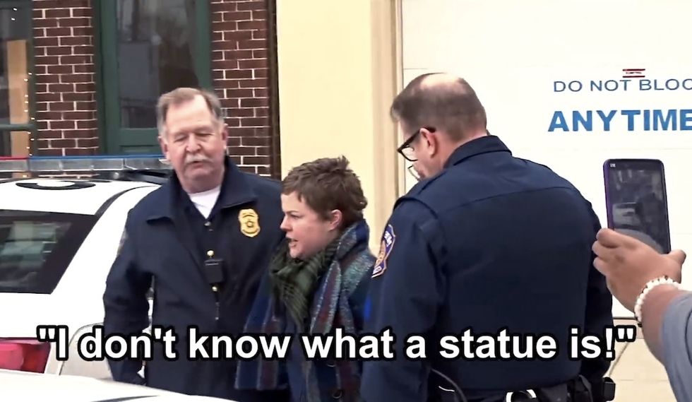 She also complained to police that "I have three men around me. Get off of me ... I don't know what a statue is."