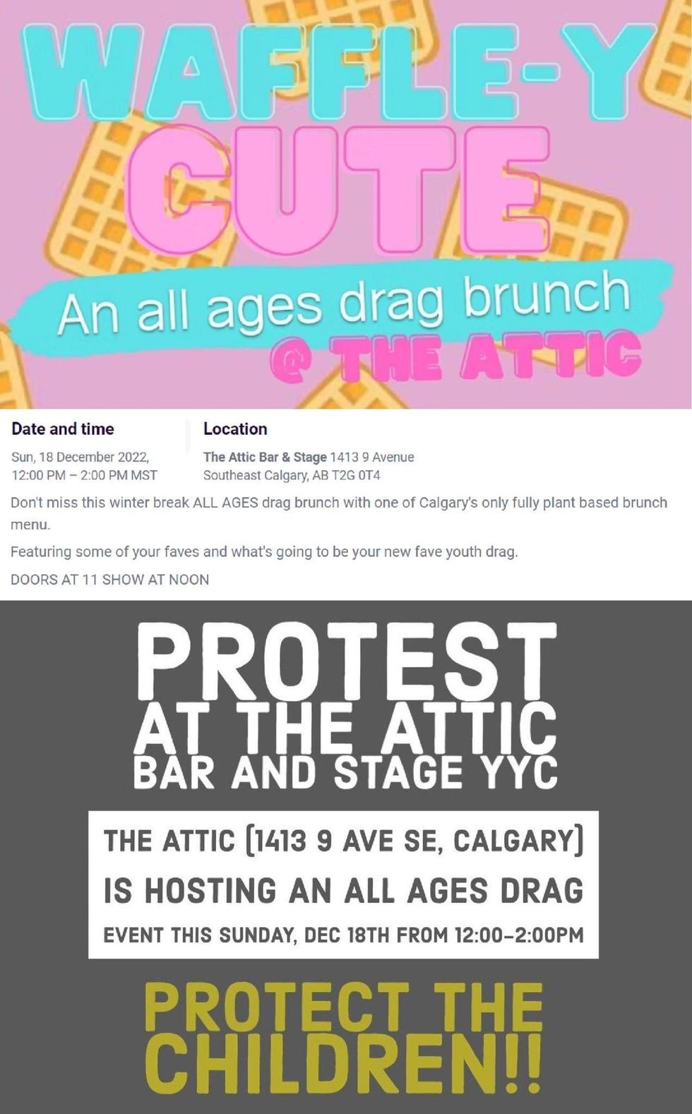 The drag show, titled "Waffle-y cute: an all ages drag brunch," took place at the Attic, a bar that has hosted drag shows previously, in the liberal district of Inglewood, Calgary. The venue posted about the event boasting its "fully plant based brunch menu," with protesters organizing on Facebook with a message of "protect the children." The protest event page has since been deleted.