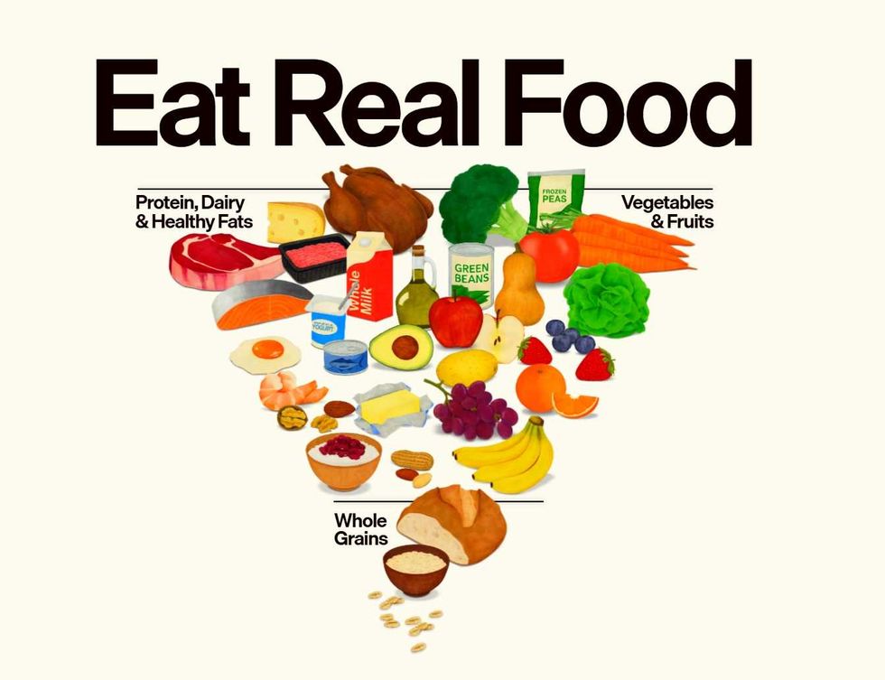 The guidelines, promoted under the simple command to "eat real food," introduce a "new pyramid" that prioritizes protein, dairy, healthy fats, and fruits and vegetables over whole grains, which is essentially an upside-down version of the conventional food pyramid most people are familiar with.